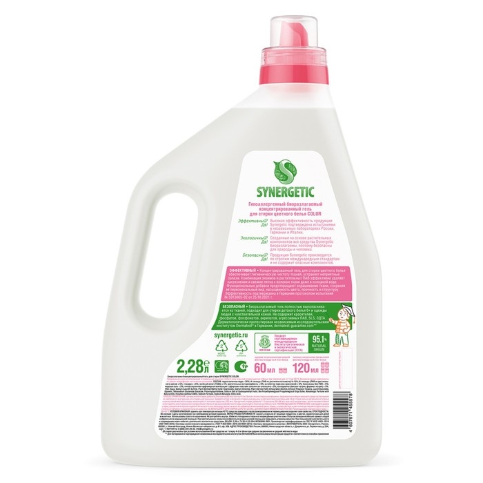 Биоразлагаемый концентрированный гель для стирки цветного белья SYNERGETIC COLOR обеспечивает бережное и эффективное очищение тканей, гигиеническую чистоту одежды и устраняет неприятные запахи. Средство можно использовать в стиральных машинах любого типа и при ручной стирке при температуре 15 - 90 °C.