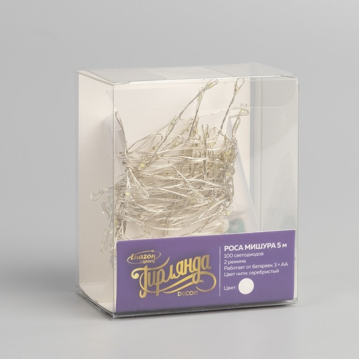 Гирлянда «Мишура» 5 м роса, IP20, серебристая нить, 100 LED, 2 режима, батарейки AAх3 (нет в комплекте), свечение белое