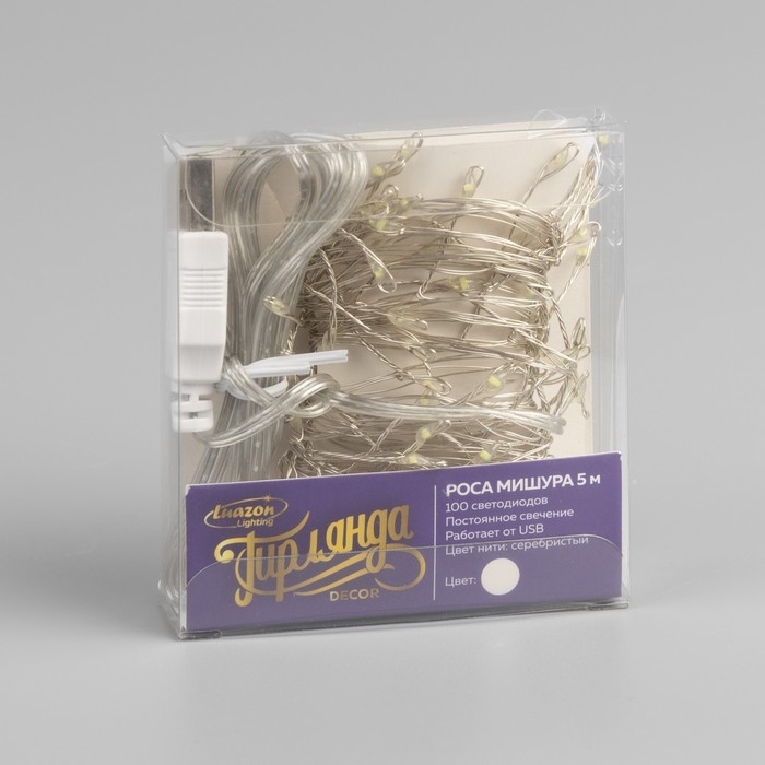 Гирлянда «Мишура» 5 м роса, IP20, серебристая нить, 100 LED, свечение белое, USB