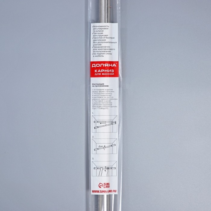 Металлический карниз работает по следующему принципу. Вы устанавливаете его одной стороной в стену и раскручиваете с другой. Так он увеличивается в размере. После того как второй край упрётся, следует сделать ещё 2–3 оборота для более надёжной фиксации. Затем просто навесьте штору с крючками и распрямите её по всей длине.