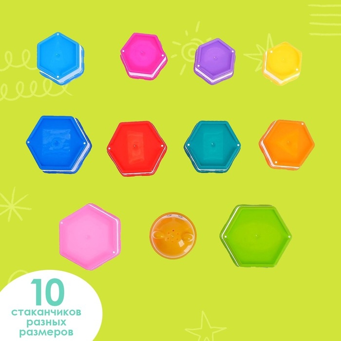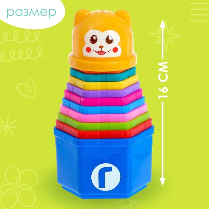 Пирамидка состоит из 11 формочек, сверху устанавливается яркая игрушка с забавной мордочкой, завершающая конструкцию.