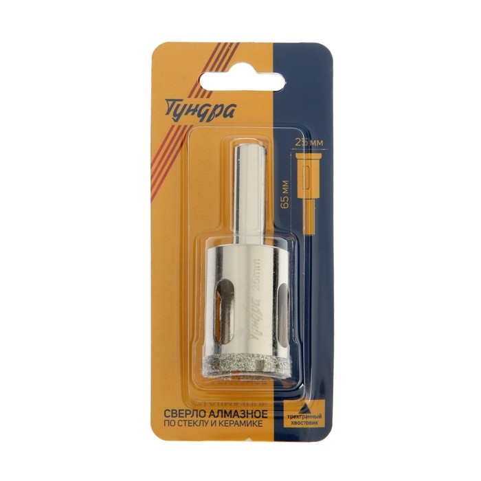 Сверло алмазное по стеклу и керамике ТУНДРА, трехгранный хвостовик, 25 х 65 мм