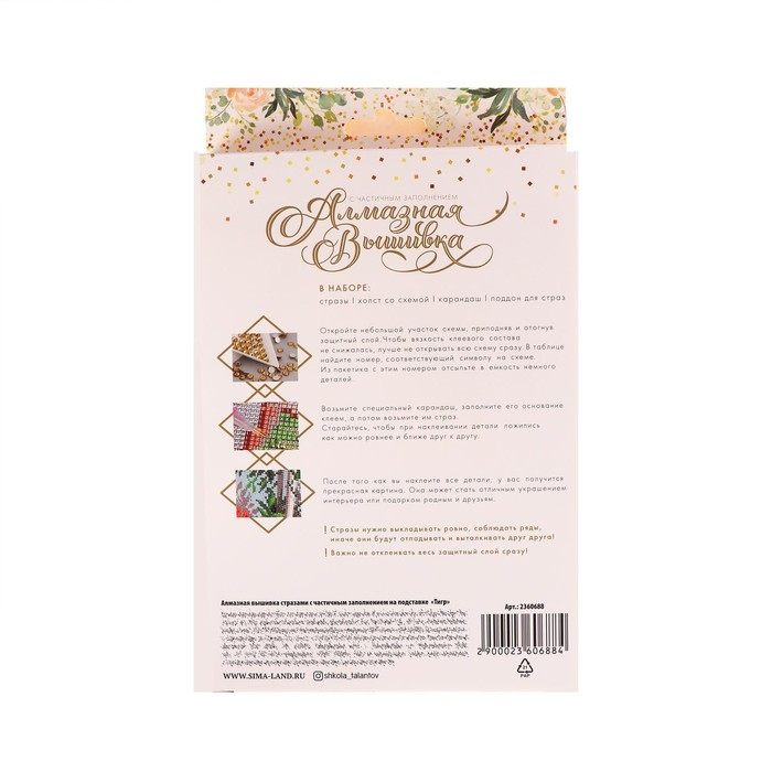 Часть картины предстоит заполнить стразами, другая часть напечатана на самом холсте — такое изделие легче и быстрее создать. Поэтому набор такого небольшого формата подойдёт для тех, кто впервые пробует свои силы в этой технике или любит быстро добиваться результата.