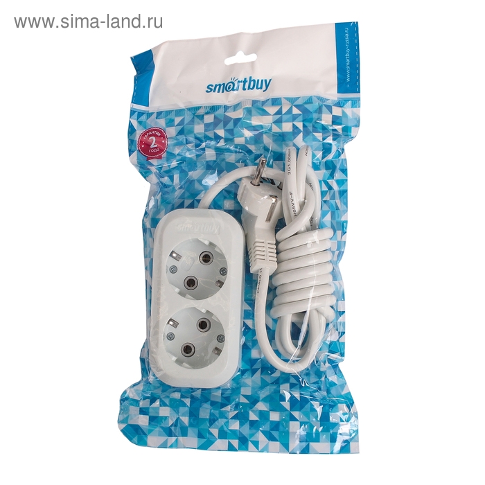 Удлинитель Smartbuy, 2 розетки, 2 м, 10 А, 2200 Вт, ПВС 2х1 мм2, без з/к, белый