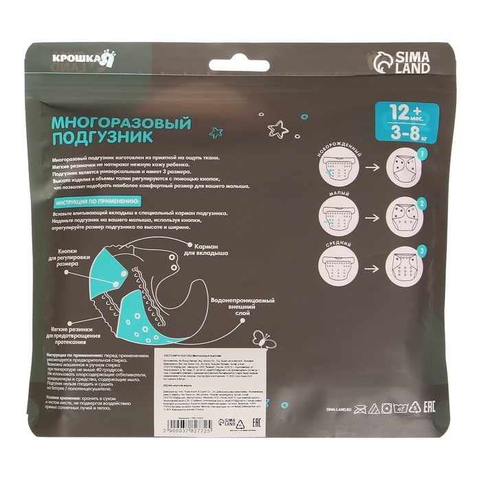 • Размер подгузника универсальный, подходит для детей от 3 до 15 кг, от рождения до 3 лет;