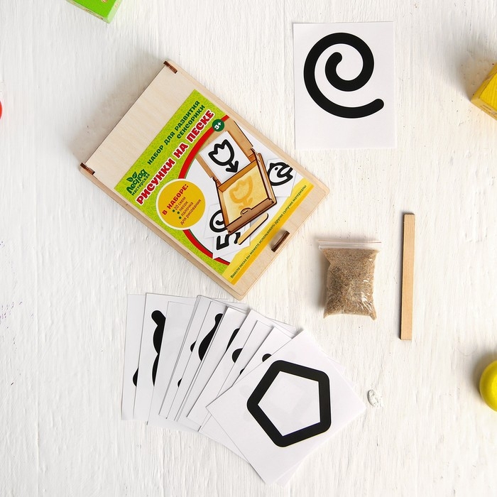 Насыпьте песок в поддон, выберите карточку и поставьте её вертикально. Задача крохи - повторить изображение с карточки на песке. Сначала малыш может делать это пальчиками, а потом палочкой.