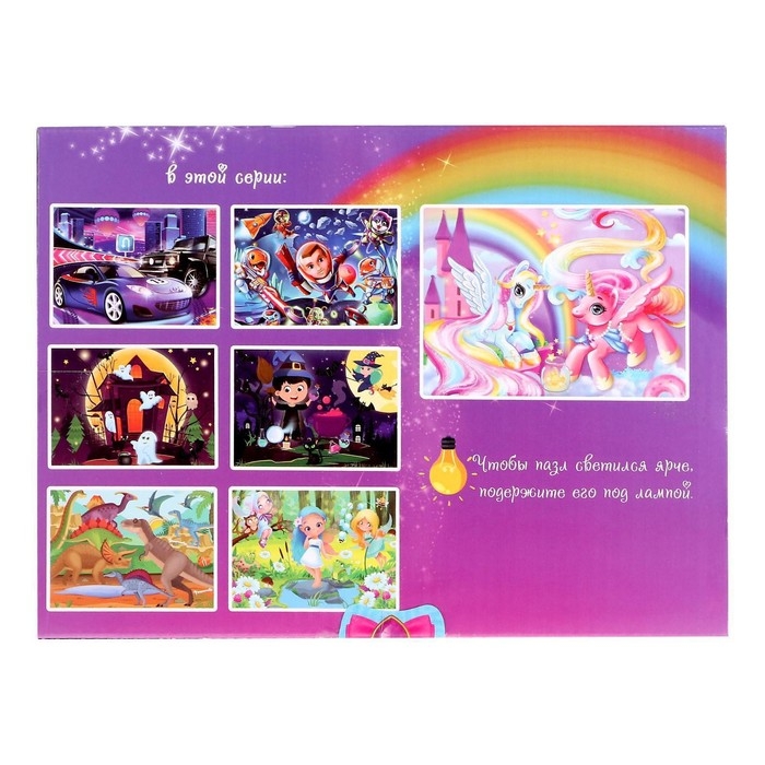 Cветящийся пазл «Страна волшебства» — это занимательная развивающая игра в новом формате. Достаточно выключить свет в комнате, и вы увидите, как собранная картинка благодаря особой краске начнёт светиться в темноте.
