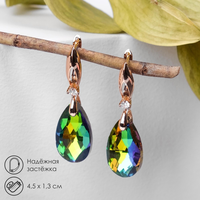 Серьги со стразами «Эдель» ромб, цвет зелёный в розовом золоте