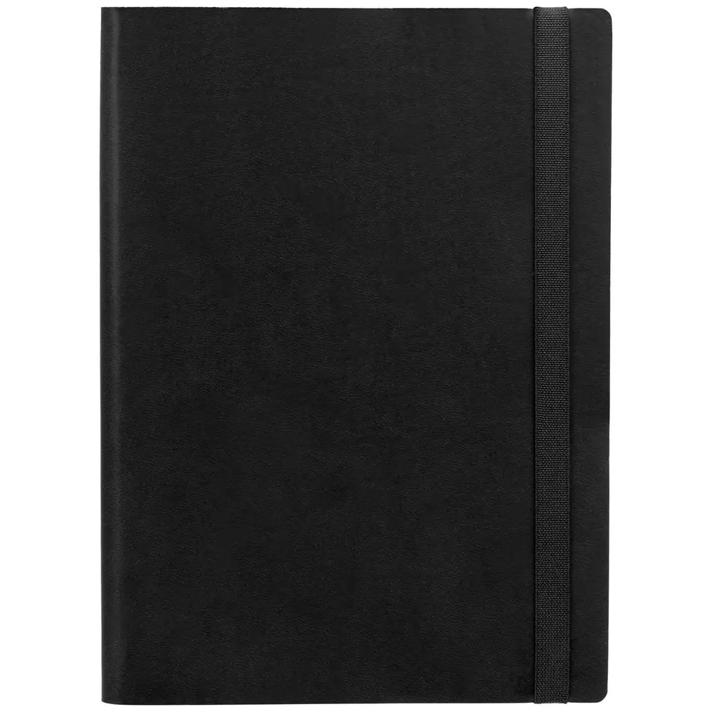 Ежедневник с гибкой обложкой выполнен из материала Latte, черный АА, и дополнен резинкой шириной 1 см, капталом и ляссе черного цвета.