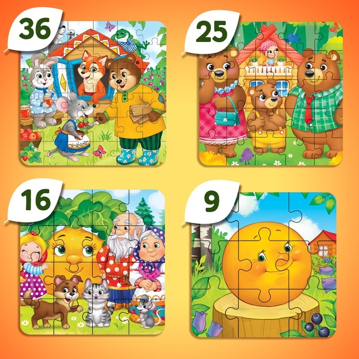 Также в комплект входит 4 пазла с разными уровнями сложности: 9, 16, 25, 36 элементов.
