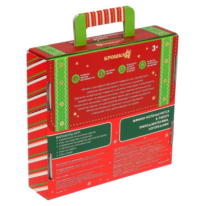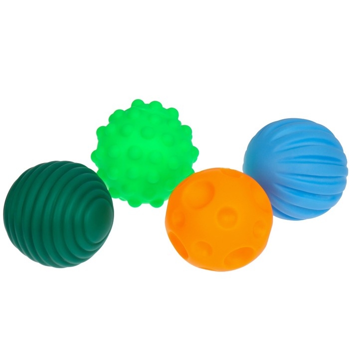 Мячики с рельефной массажной поверхностью способствуют развитию мелкой моторики и тактильных ощущений. Давление на фактурную поверхность мячиков стимулирует и благоприятно воздействует на нервные окончания, ответственные за большинство процессов в организме. Шарики имеют яркие цвета, которые способствуют развитию зрения, а пищалка внутри развивает слуховое восприятие.
