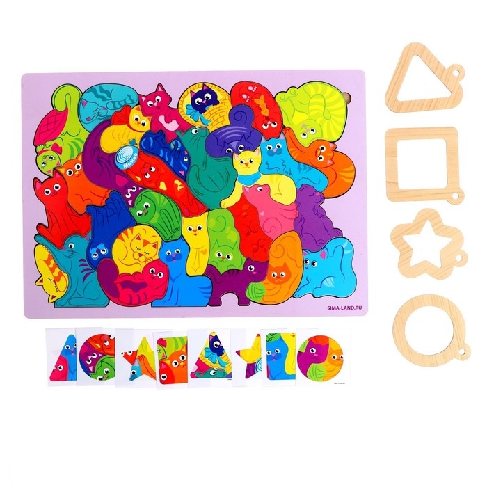 Сначала можно собрать детали в основу, а затем сыграть в сыщика. Покажите малышу варианты "луп" (деревянные основы), а потом покажите один из цветных фрагментов. Ребёнку необходимо подобрать "лупу" нужной формы и найти фрагмент на общей картинке.