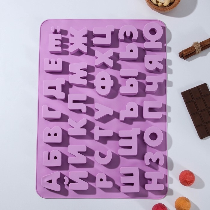 Форма для кондитерских украшений Доляна «Буквы. Алфавит русский», силикон, 36,6×26,6×2 см, 33 ячейки (3,5×3 см), цвет сиреневый
