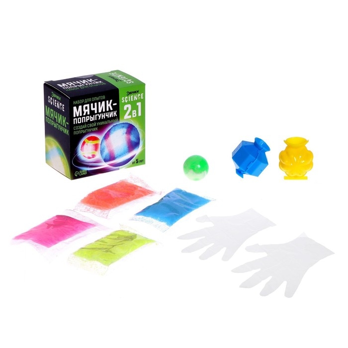 С набором «Мячик-попрыгунчик» ребёнок проведёт химический опыт и создаст прыгающий шарик своими руками.