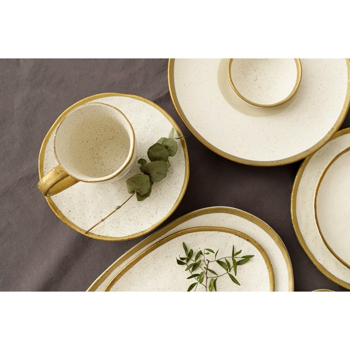 Посуда серии Magistro Poursephona — это современная фарфоровая посуда. В оформлении серии превалируют два цвета – бежевый оттенок фарфора и роскошное золото в виде широкой окантовки предметов. Идеально подходит как для формального обеда, так и для торжеств по особым случаям. Лаконичные формы, золотая окантовка, разноцветные вкрапления придают изделиям из фарфора одновременно необычный и современный вид.