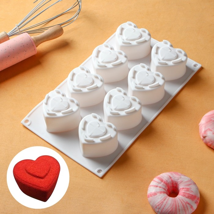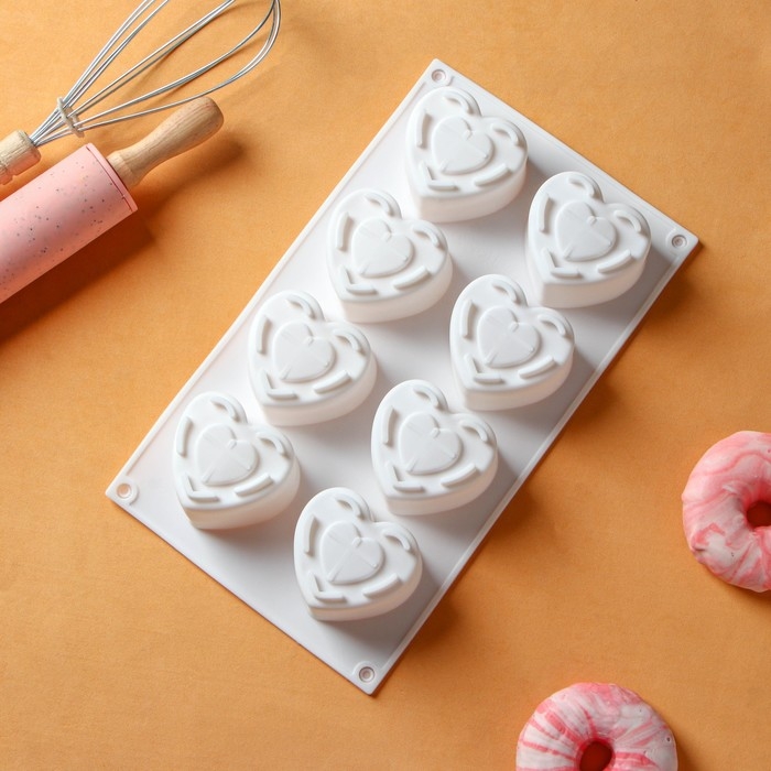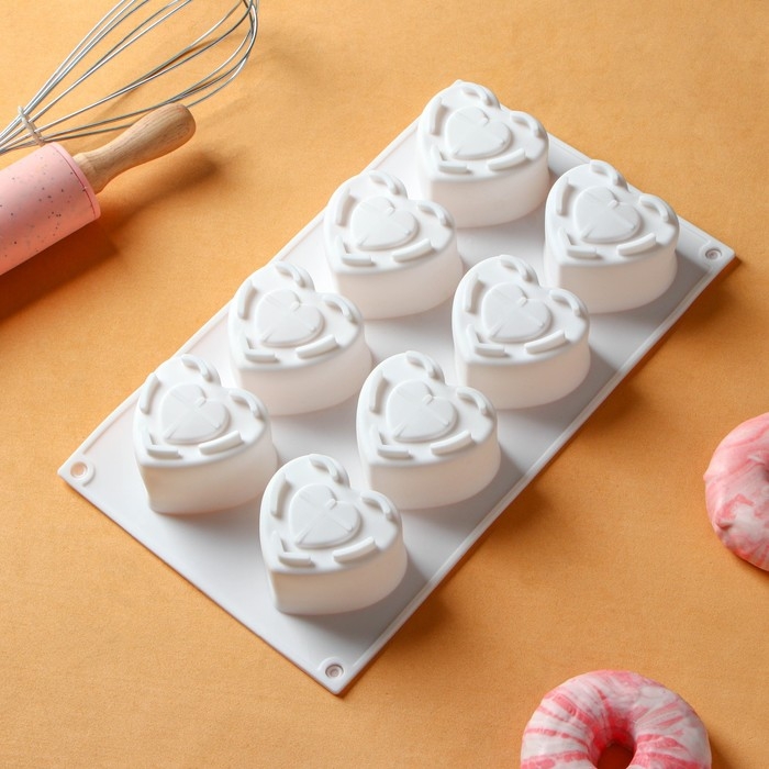 Форма для муссовых десертов Доляна «Сердце», силикон, 29×17×4,3 см, 8 ячеек (5,5×6,2×3,5 см), цвет белый