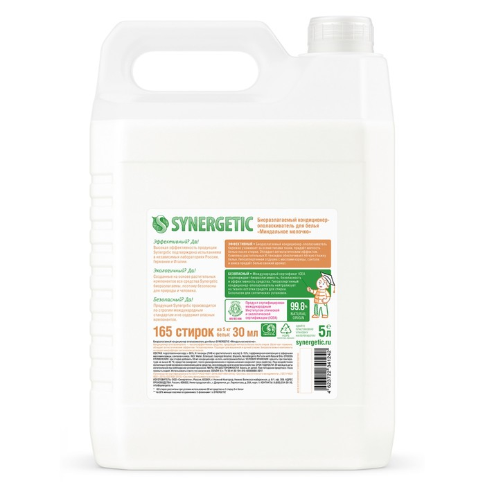 Кондиционер-ополаскиватель для белья Synergetic "Миндальное молочко",гипоаллергенный,биоразлагаемый, 5 л