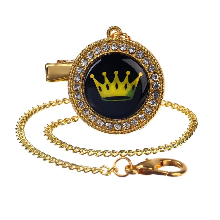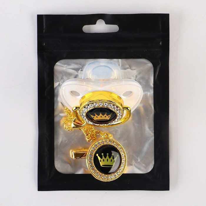 Соска - пустышка силиконовая ортодонтическая «BOSS», от 6 мес., с колпачком + держатель - цепочка, цвет черный/золото, стразы