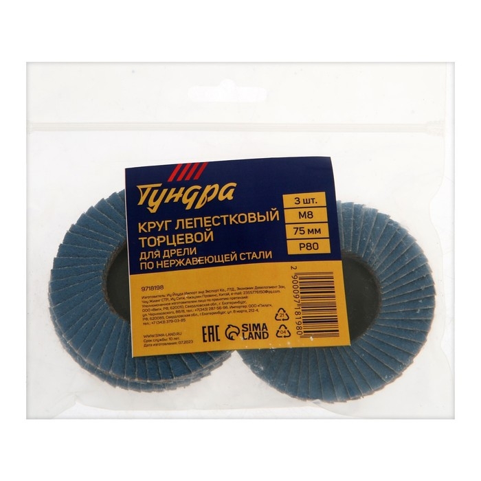 Круг лепестковый торцевой ТУНДРА, по нержавеющей стали, для дрели, М8, 75 мм, P80, 3 шт.