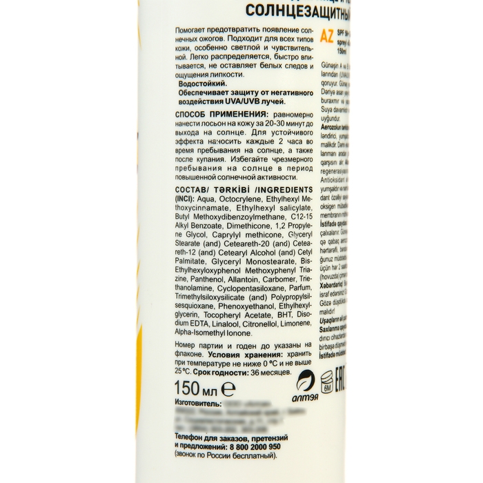 Лосьон для лица и тела "Алтэя" солнцезащитный , 150 мл