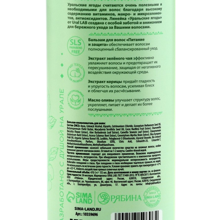 Бальзам для волос с экстрактом зелёного чая, корицы и маслом оливы, питание и защита, 470 мл, URAL LAB