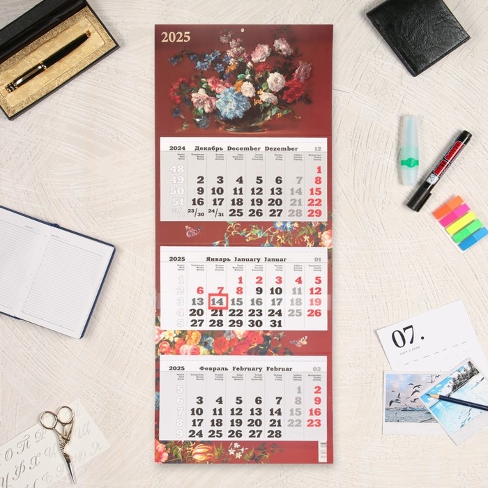 Календарь настенный квартальный Премиум трио "Цветы" 2025 год, 34 х 84 см