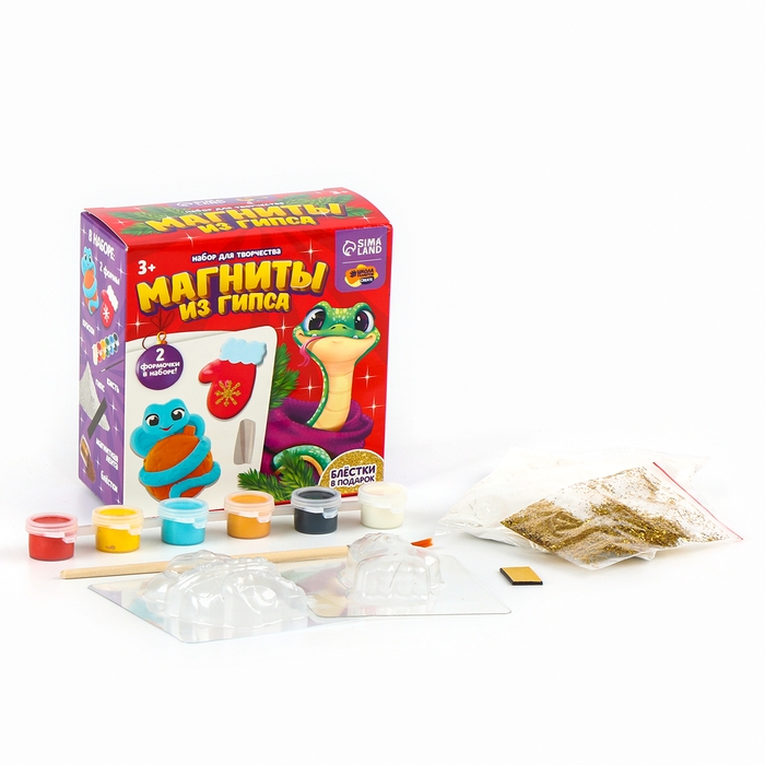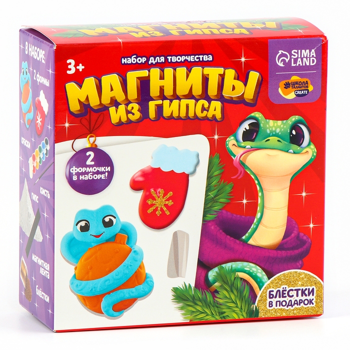 Магниты из гипса на новый год своими руками «Змейка с варежкой», новогодний набор для творчества, символ года 2025