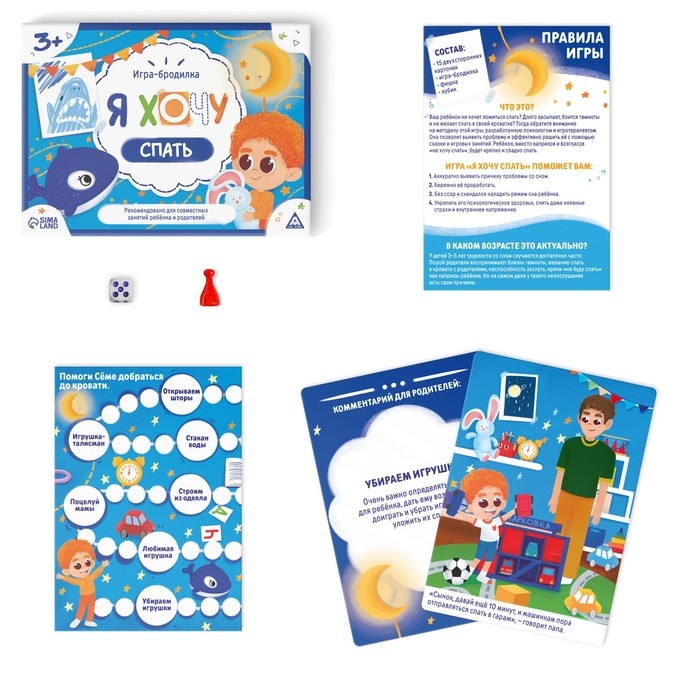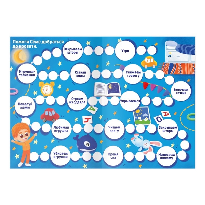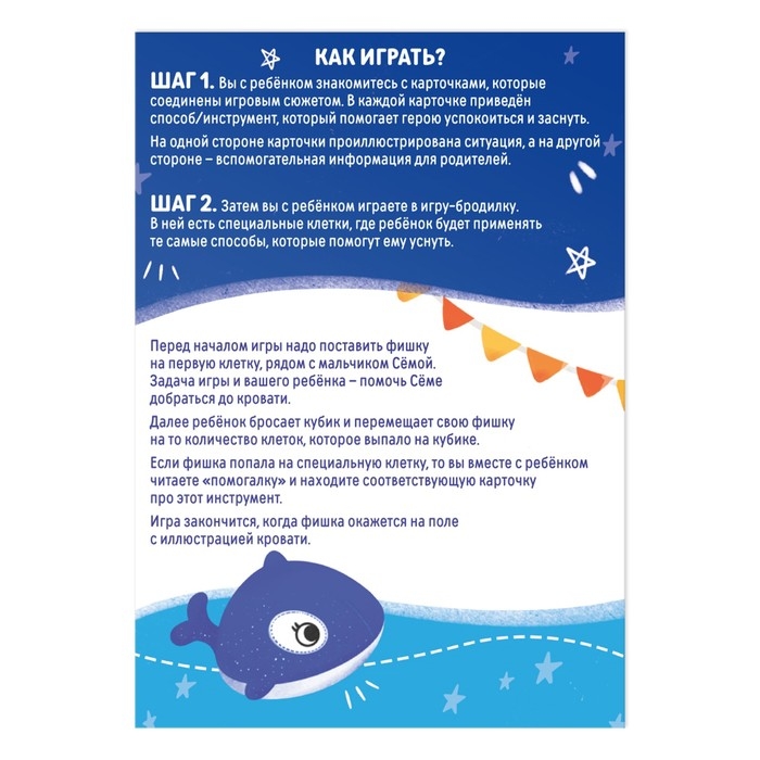 Перед вами игра 2 в 1: терапевтические карточки, которые помогут ребёнку заснуть, и интересная бродилка. Данная игра поможет выявить проблему и эффективно решить её с помощью сказки и игровых занятий. Ребёнок, вместо капризов и возгласов «не хочу спать», будет крепко и сладко спать.