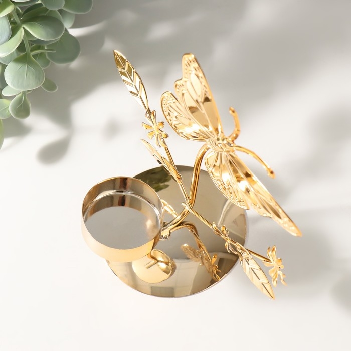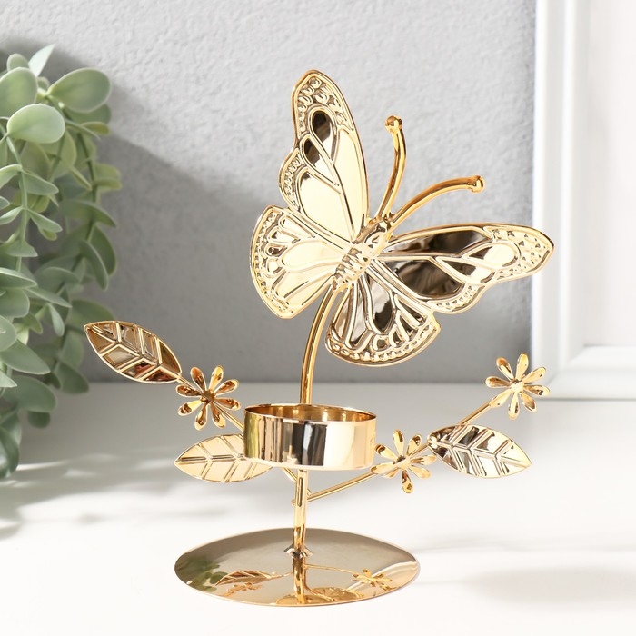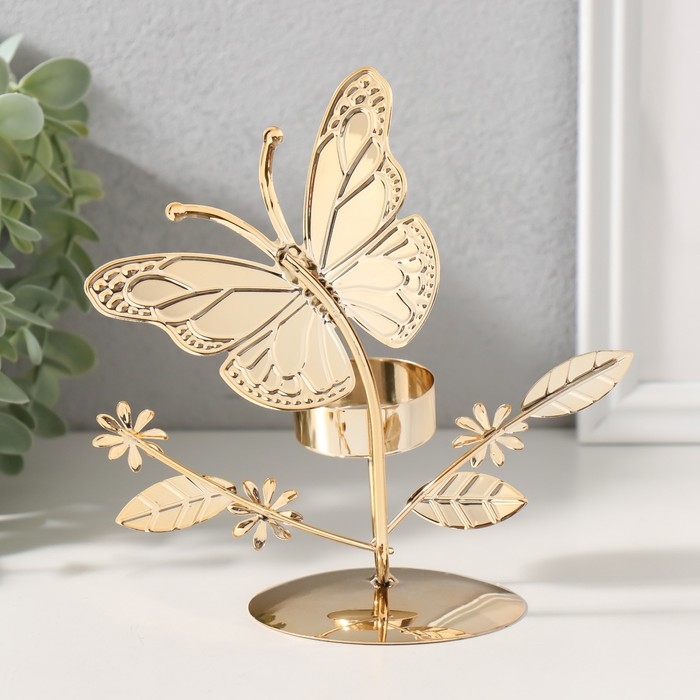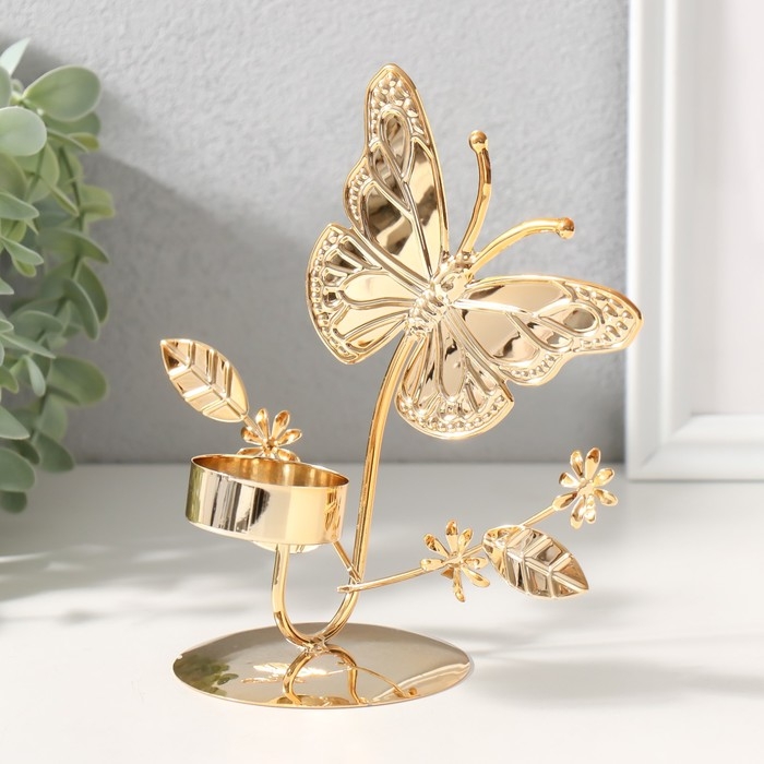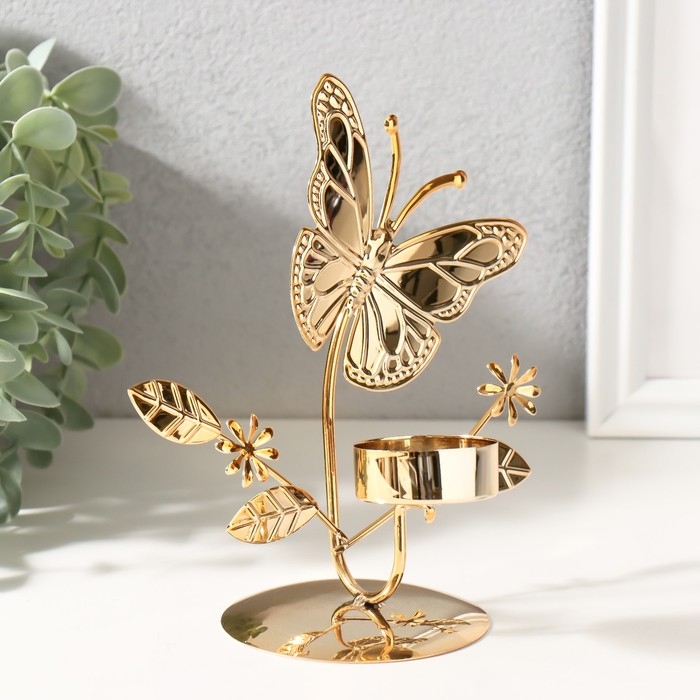 Подсвечник на 1 свечу металл d=4 см "Бабочки в поле" золото 7,7х14х16 см