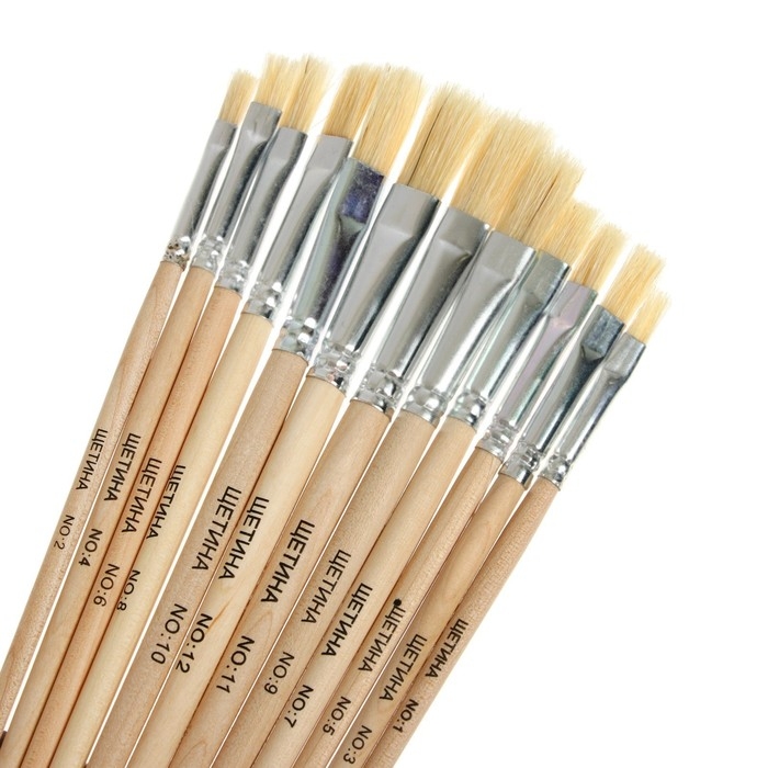 Набор кистей щетина 12 штук: № 1, 2, 3, 4, 5, 6, 7, 8, 9, 10, 11, 12, плоские