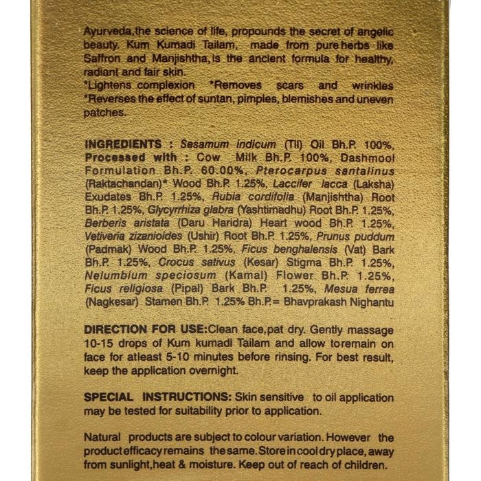 Состав: Шафран, Кунжутное масло (Sesamum indicum), Саппановое дерево (Caesalpinia sappan), Фикус бенгальский (Ficus benghalensis), Дизоксилум малабарский (Dysoxylum malabaricum), Лакричник (Glycyrrhiza glabra), Монохория влагалищная (Monochoria vaginalis), Шеллак (Laccifer laca), Марена сердцелистная (Rubia cordifolia), Лотос Комарова (Nelumbium speciosum), Ветивер (Vetiveria zizanioides), молоко коровье 20 мл.