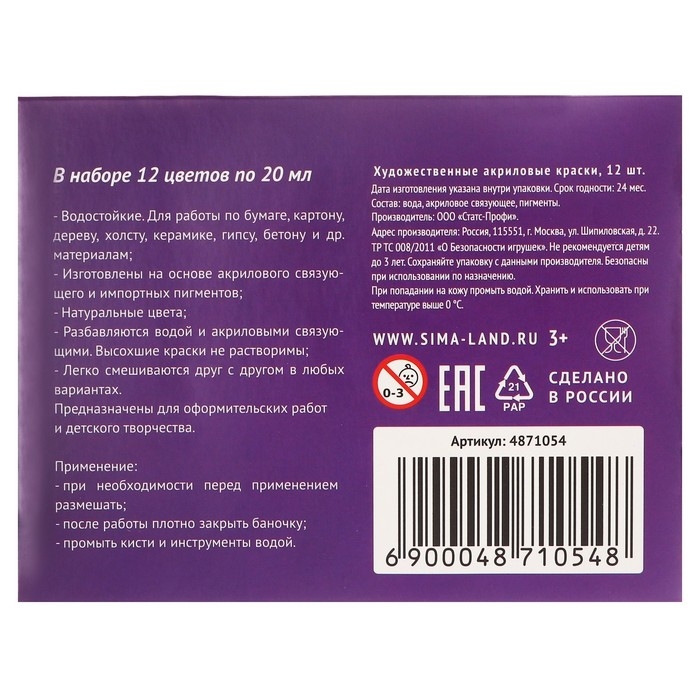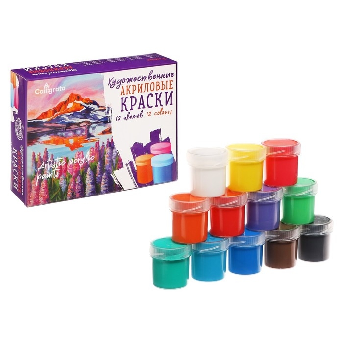 Краска акриловая, набор 12 цветов х 20 мл, Calligrata, художественная, морозостойкая, в картонной коробке