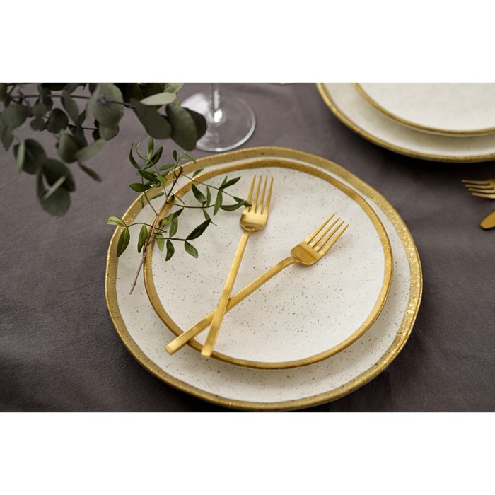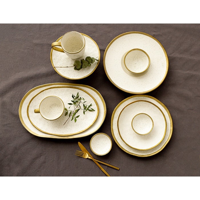 Посуда серии Magistro Poursephona — это современная фарфоровая посуда. В оформлении серии превалируют два цвета – бежевый оттенок фарфора и роскошное золото в виде широкой окантовки предметов. Идеально подходит как для формального обеда, так и для торжеств по особым случаям. Лаконичные формы, золотая окантовка, разноцветные вкрапления придают изделиям из фарфора одновременно необычный и современный вид.