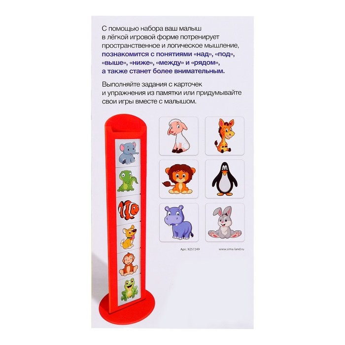 «Зверушки в ряд» — развивающий набор для детей от 3 лет. Такое развлечение познакомит малыша с понятиями пространства: «над», «под», «выше», «ниже», «между» и «рядом». Малыша ждут увлекательные задания и яркие карточки с изображением животных.