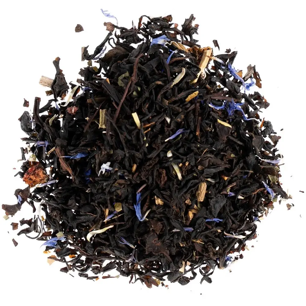 Праздничный купаж на основе черного чая, украшенный цветочными лепестками и кусочками клубники.Состав: черный индийский чай, сушеная клубника, клубничный лист, цветки василька, ароматизатор «клубника».