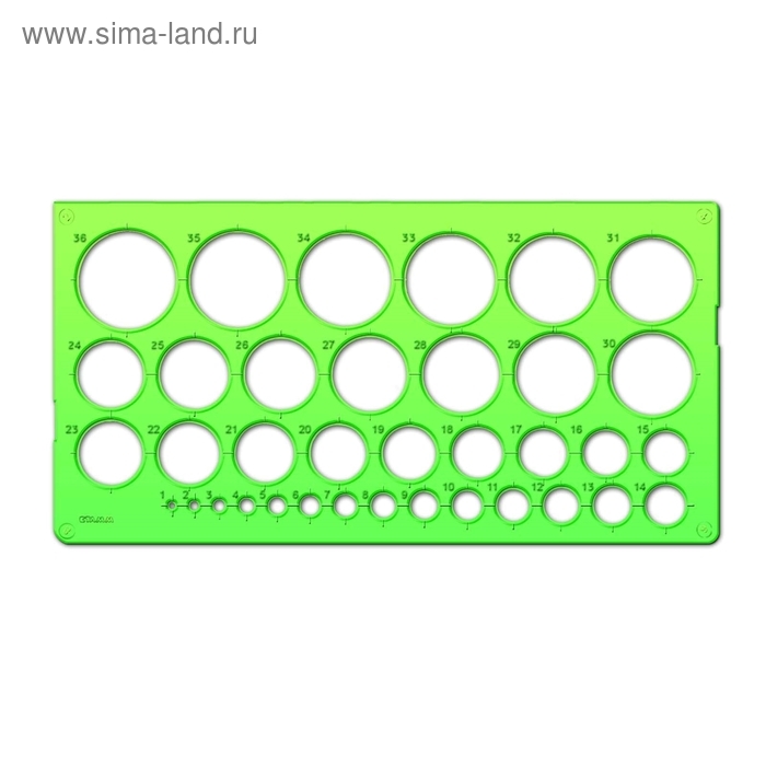 В трафарете вырезаны 36 окружностей различного диаметра, что позволяет изобразить окружность диаметром от 1 мм до 36 мм и определить её центр с помощью шкалы делений.