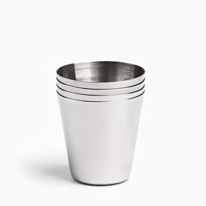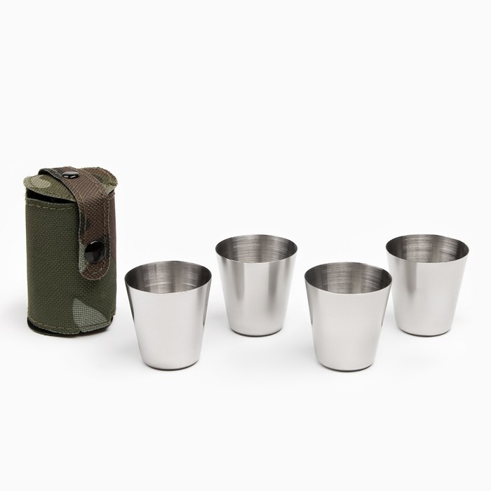 Набор стопок из 4 штук по 30 мл из пищевой нержавеющей стали в компактном чехле. Легкие и компактные, удобно брать с собой на отдых, рыбалку, охоту, природу или в путешествия.