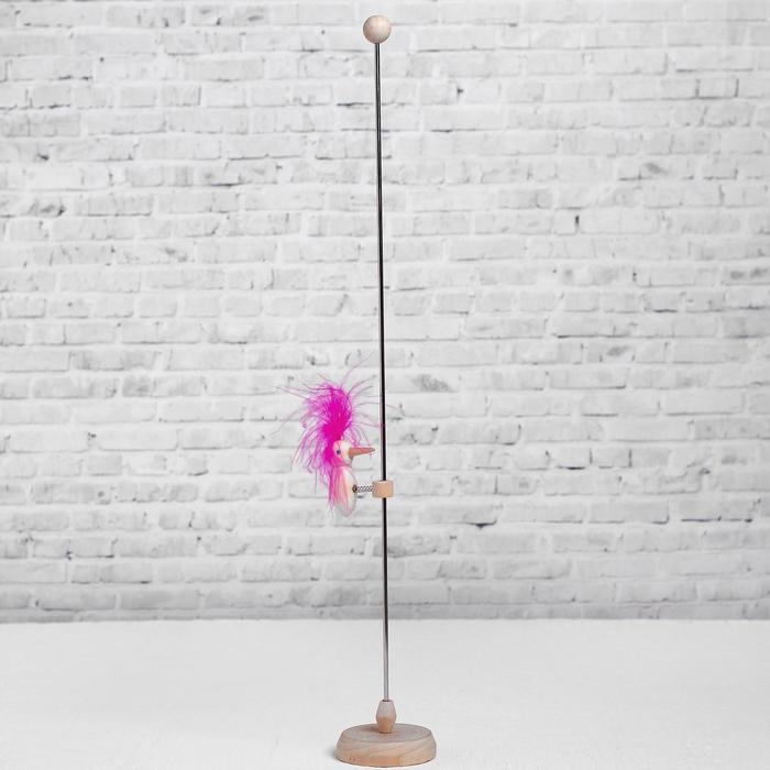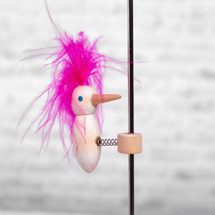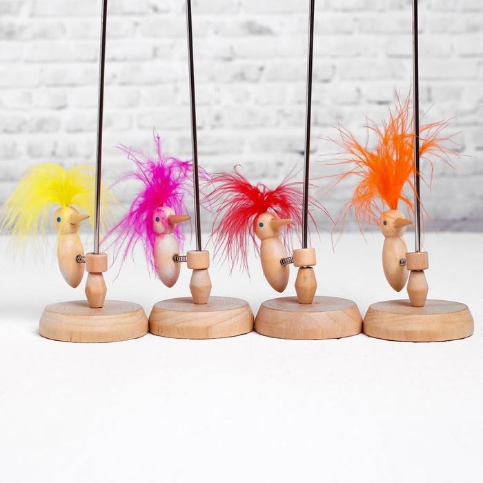 Игрушка сделана из прочного дерева и натуральных перьев птицы, которые окрашены безопасными компонентами.