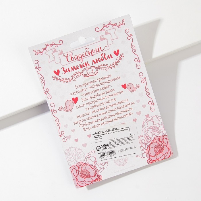 Замок для торжественной свадебной традиции - это символ любви. Навесной замок любви на свадьбе становится символом нерушимого союза, заключенного влюбленными в этот день. По традиции замок вешается на мост, загадывается желание о счастливой семейной жизни. Это делается для того, чтобы никто никогда не смог открыть этот замок и нарушить клятву, данную влюбленными. Свадебный замок можно повесить на мост по традиции или на дерево в специалных парках или аллеях молодожен, которые есть во многих городах. Традиция закрывать замок на свадьбу объединяет сердца мужа и жены навсегда. Свадебный декоративный замочек будет отлично смотреться на фотосессии и видео.
