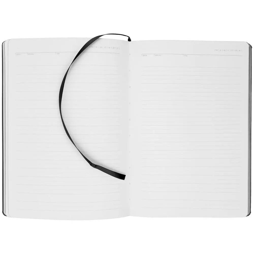 Ежедневник с твердой обложкой. Выполнен из материала Latte, черный, дополнен ляссе в цвет обложки.