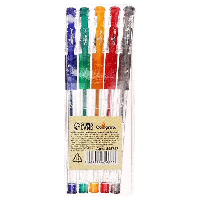 Набор гелевых ручек, 5 цветов, металлик,с резиновыми держателями, МИКС