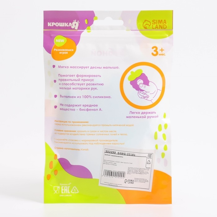 Форма и размеры изделия разработаны специально для детской ладони. Его рельефная текстура будет способствовать развитию мелкой моторики, а яркие цвета — формированию визуального восприятия у ребёнка.