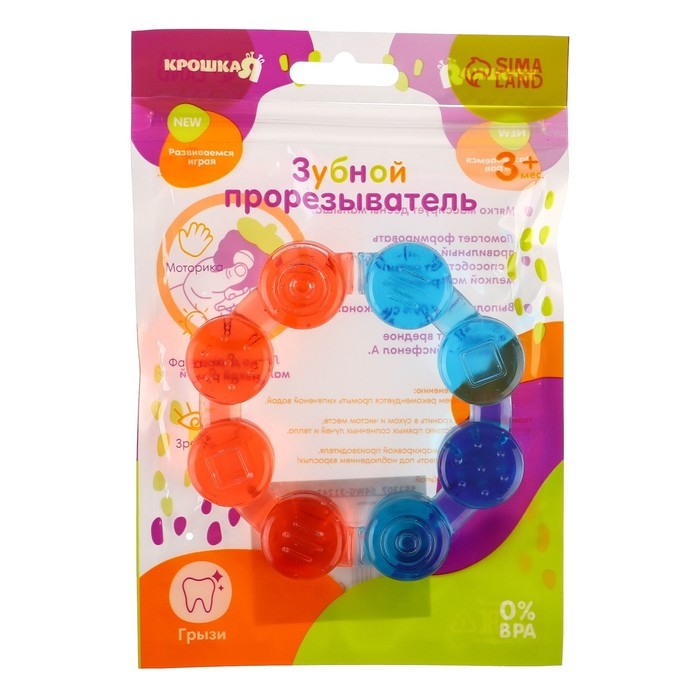 Специальная жидкость внутри поможет снизить воспаление в ротовой полости и снять болевые ощущения. Для охлаждения прорезывателя поместите его в холодильник на 10‒15 минут. Форма ручки и размеры разработаны специально для детской ладони, поэтому малышу будет удобно её держать. Рельефная структура на поверхности изделия и его дополнительных элементов будет способствовать развитию мелкой моторики, а яркие цвета — формированию визуального восприятия мира.