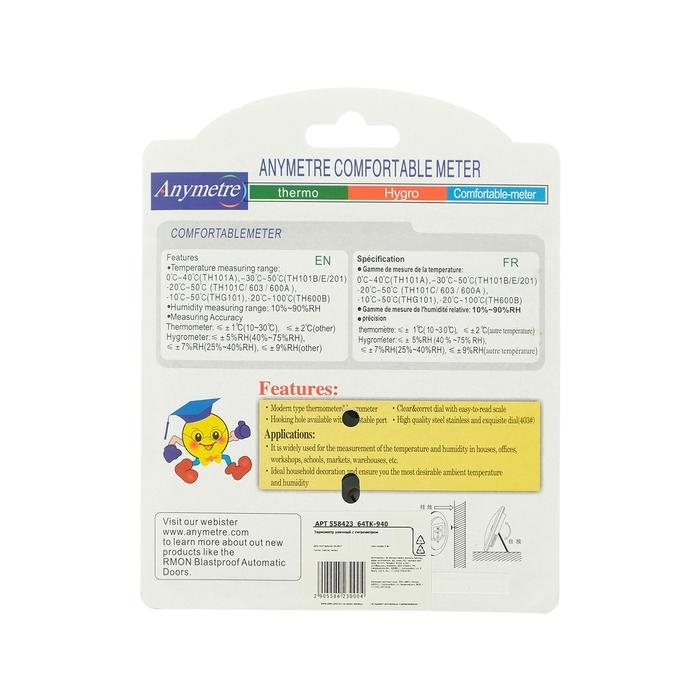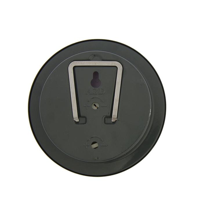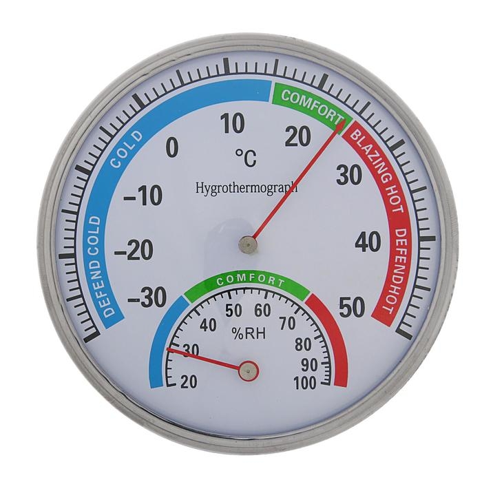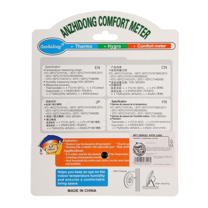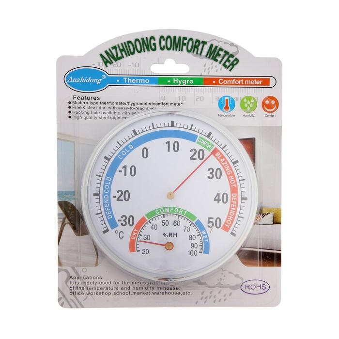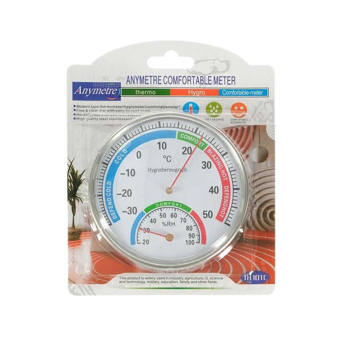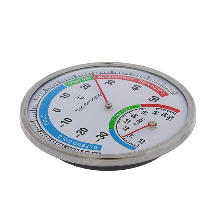 Основной циферблат отображает температуру воздуха по Цельсию, а гигрометр, расположенный в нижней части изделия, — уровень относительной влажности в процентах. Цветовая гамма каждой шкалы указывает степень комфорта: