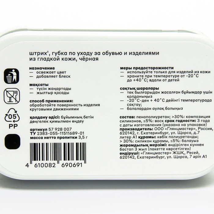 - Моментально обновляет внешний вид, очищает и придает мгновенный блеск обуви и изделиям из гладкой кожи.