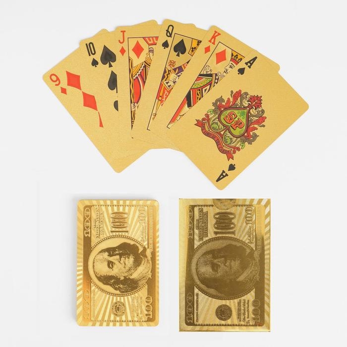 Выбирайте карты игральные пластиковые "100 долларов", 54 шт, 30 мкм, 8.8×5.7 см, золотистые и наслаждайтесь любимой игрой.