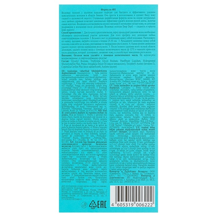 Специальная ткань лишена эластичности, что дает возможность делать короткое резкое движение при отрыве полоски, предотвращая болезненные ощущения. Входящий в состав воска азулен препятствует сухости и шелушению кожи после депиляции.