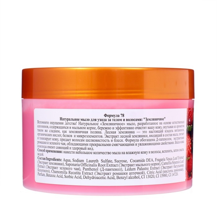 Вспомните ощущения детства! Натуральное «Земляничное» мыло, разработанное на основе естественных сапонинов, содержащихся в мыльном корне, бережно и эффективно очистит вашу кожу, окутывая ее ароматом таким же сладким, как земляничная поляна. Лесная земляника — это настоящий кладезь витаминов, органических кислот, белков и микроэлементов. Экстракт лесной земляники, входящий в состав мыла, питает и тонизирует кожу, придает волосам шелковистость и блеск. Формула обогащена протеинами козьего молока, которые обладают прекрасными смягчающими и увлажняющими свойствами. Ваша кожа и волосы имеют сияющий и здоровый вид.