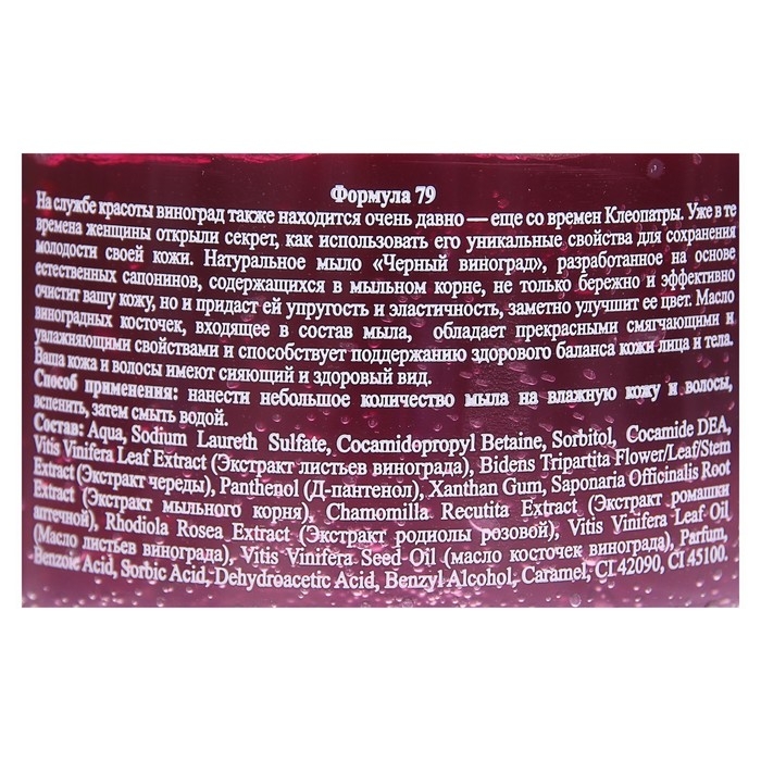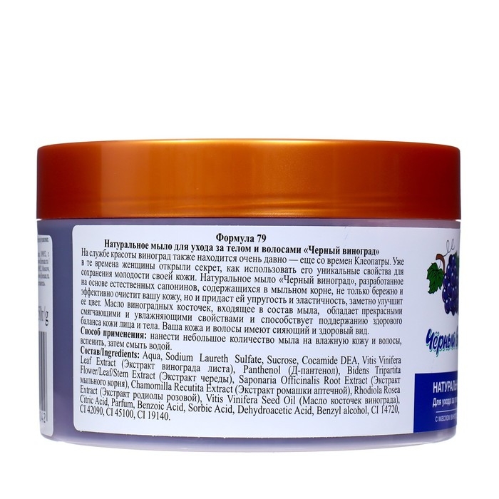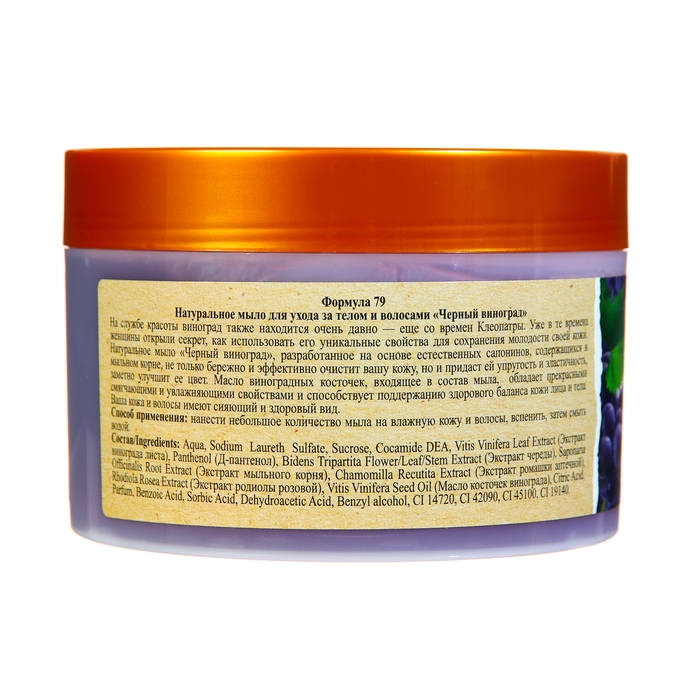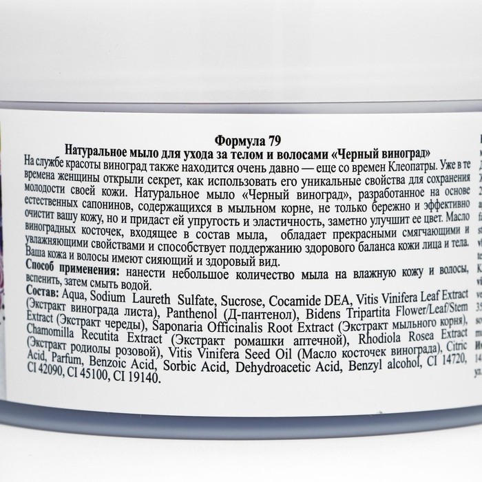 На службе красоты виноград также находится очень давно — еще со времен Клеопатры. Уже в те времена женщины открыли секрет, как использовать его уникальные свойства для сохранения молодости своей кожи. Натуральное мыло «Черный виноград», разработанное на основе естественных сапонинов, содержащихся в мыльном корне, не только бережно и эффективно очистит вашу кожу, но и придаст ей упругость и эластичность, заметно улучшит ее цвет.