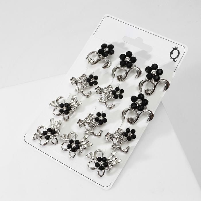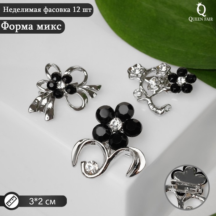 Брошь «Цветы» мини, форма МИКС, цвет чёрно-белый в серебре (неделимая фасовка 12 шт., цена за шт.)